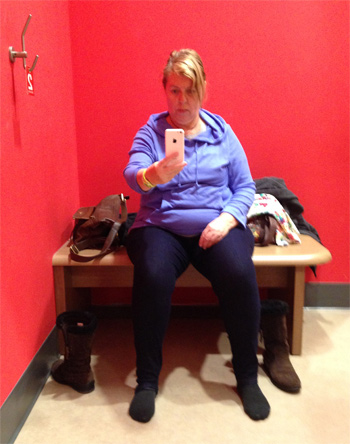 In the change room at Target Mia grabs a (disgruntled) selfie while on the hunt for ‘cute’ workout wear in XXL which proved to be one of her biggest challenges.