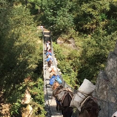 BARB: Farm smells, mules, Yaks, bells, incense, piles of hiking gear, monks, people washing in the same water as the animals drank. The people coming back were mostly smiling, first views of the Himalayas – BIG, trying to walk carefully over rocks on the main street of town and not fall in the first hour.