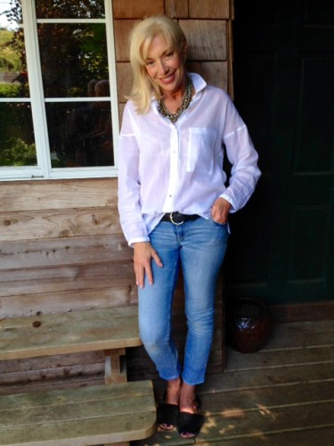 It seems I had devised a system over the years. I’d take an item—say a white shirt— lock in a favourite way of wearing it and then wear it only that way forever more. What a crazy, inefficient, uneconomical way to run a wardrobe!Hmmm….I’m thinking there (must be) others like me. So I asked Micolle if she would help me establish new behaviors! We began by taking something that most of us have in our closet—the famous WHITE SHIRT . Micolle got to work offering up 5 great ways to wear the white shirt that lives in my closet!