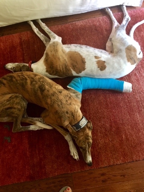 The surgeon had a challenging time dealing with the shattered bone and finally settled on securing the leg with a titanium plate and fusing the wrist. It was challenging 5 hour surgery with the last 90 minutes spent suturing what the surgeon referred to as ‘greyhound skin’ closely resembling wet tissue paper.