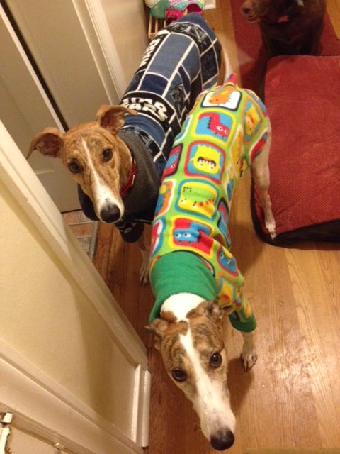 Greyhounds have very little fur so they have to be insulated in bad weather. M + K have a nice wardrobe of sweaters, raincoats, winter and all weather coats to keep them toasty warm and dry. I bundle and un-bundle them 4X’s a day to go for walks. I help them put arms into sleeves and fasten closures. Then I get myself ready. I’m having an attack of Deja vu.