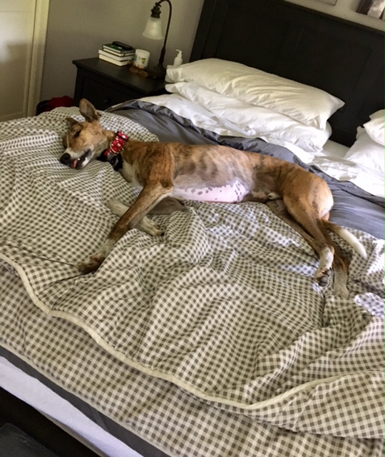 Mila and I are upstairs. She is on the bed having taken over my husband’s spot.