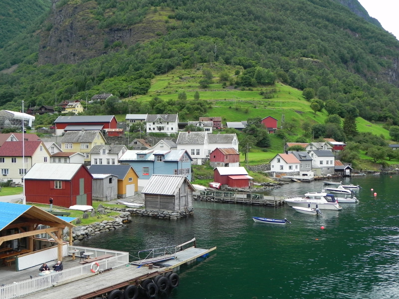 The first leg of the trip from Bergen to Voss was, what else, rainy, so didn’t see much. It cleared after about half an hour and it is gorgeous scenery. Next was a bus to Gudvangen and the last part was downhill in a series of a dozen absolutely “hairpin” turns that eventually end up in a beautiful valley, past stunning waterfalls and amazing views – I’m pretty sure the whole bus was holding its collective breath and we broke into applause for the driver when we reached the bottom!
