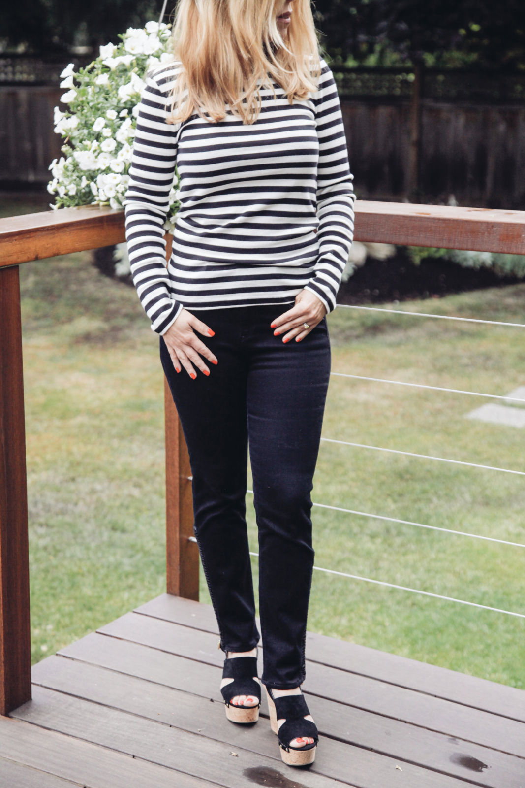1. If you’re like me and have narrow shoulders and a smaller bust a crew or v-neck with horizontal stripes works well.